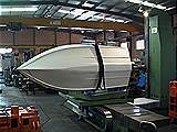 A 5m composite mono hull race boat (1750 Tunnel Deck Bullet) being checked, measured and machined to ensure optimum performance.